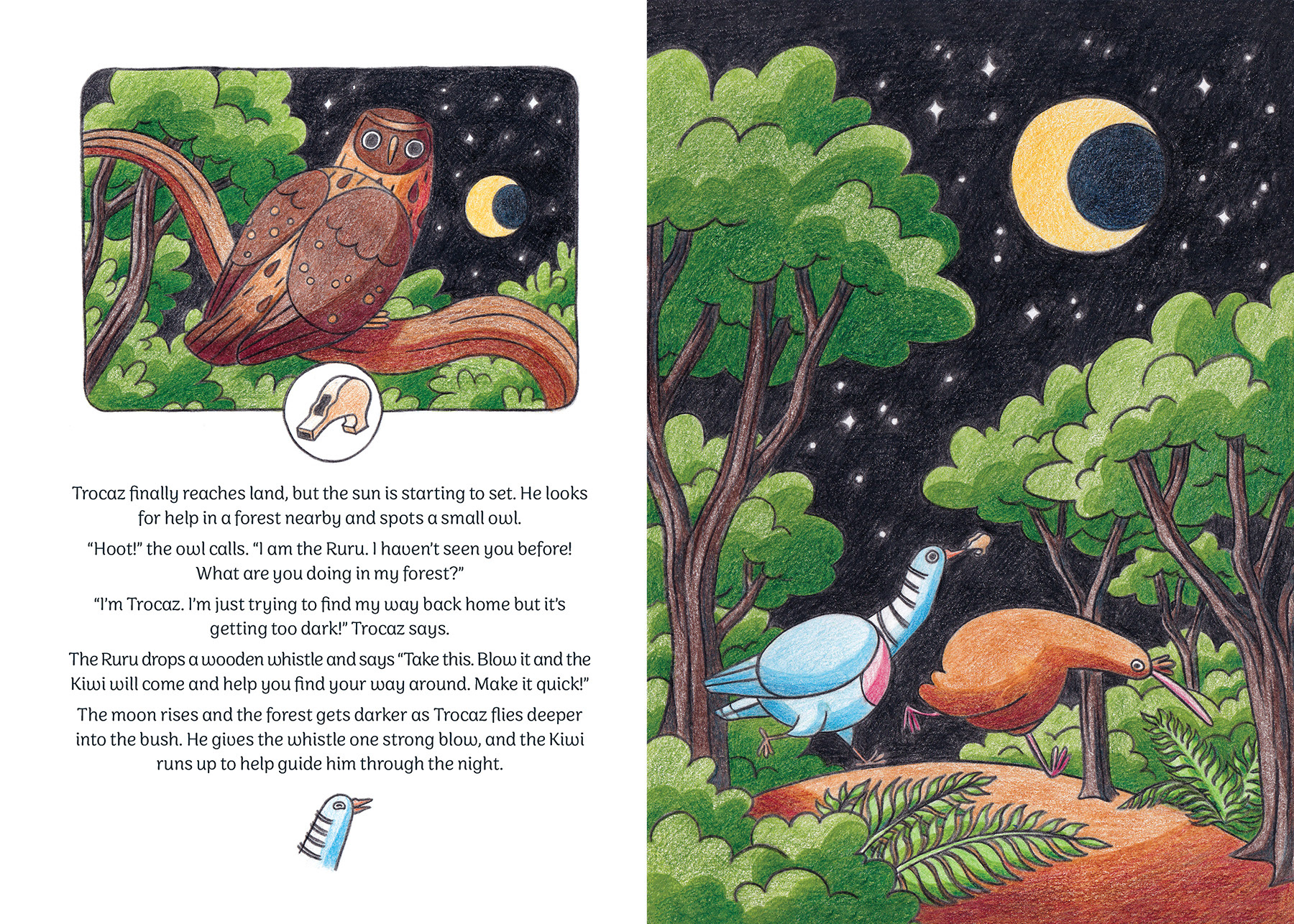 Trocaz is a short children's picture book that follows a Madeiran pigeon who is swept away in a storm and finds himself in Aotearoa New Zealand. It was a project made for a university brief focused on visual storytelling and narrative design. I drew inspiration from Aesop's Fables and wrote a story about self-discovery and belonging.